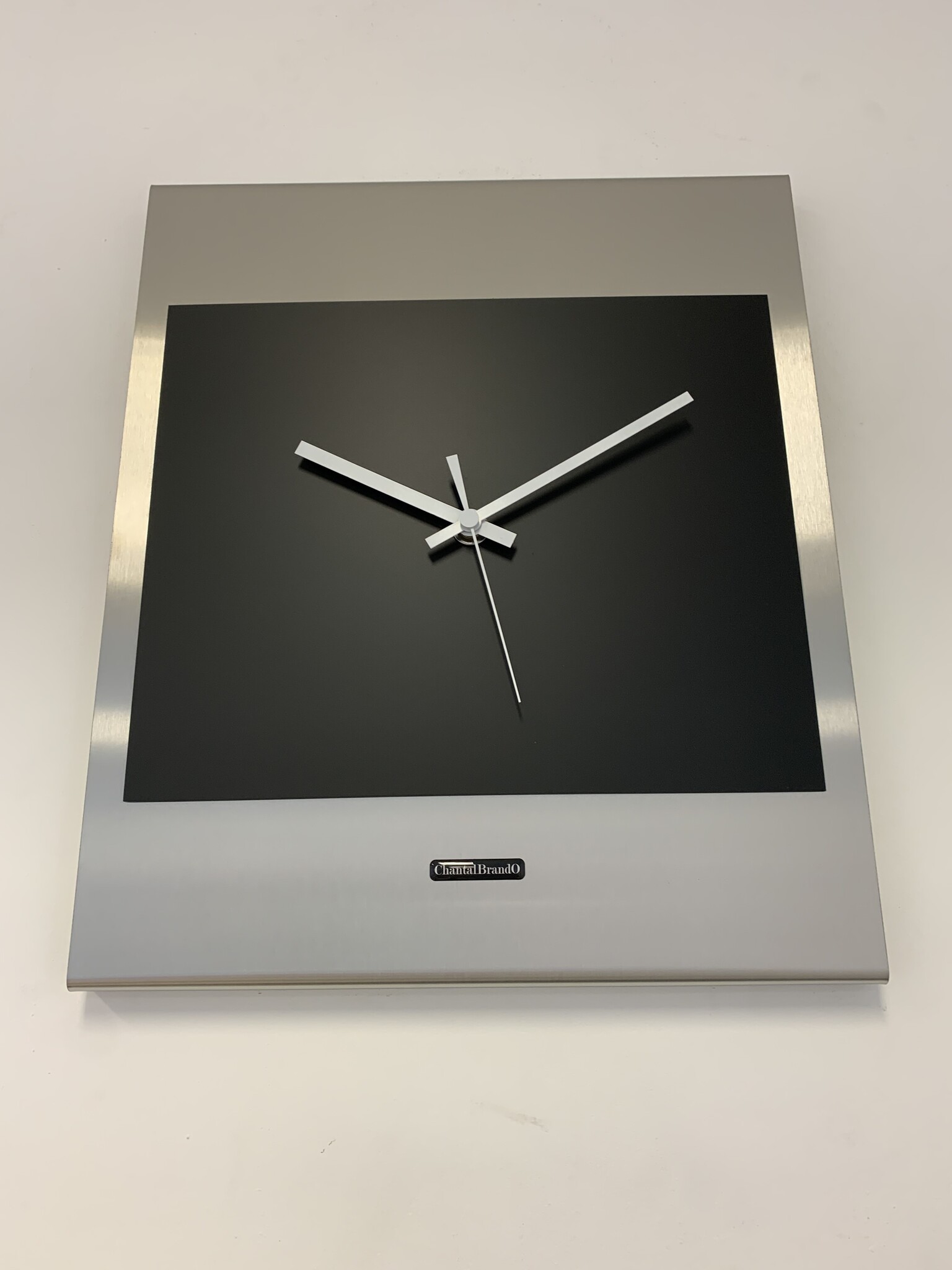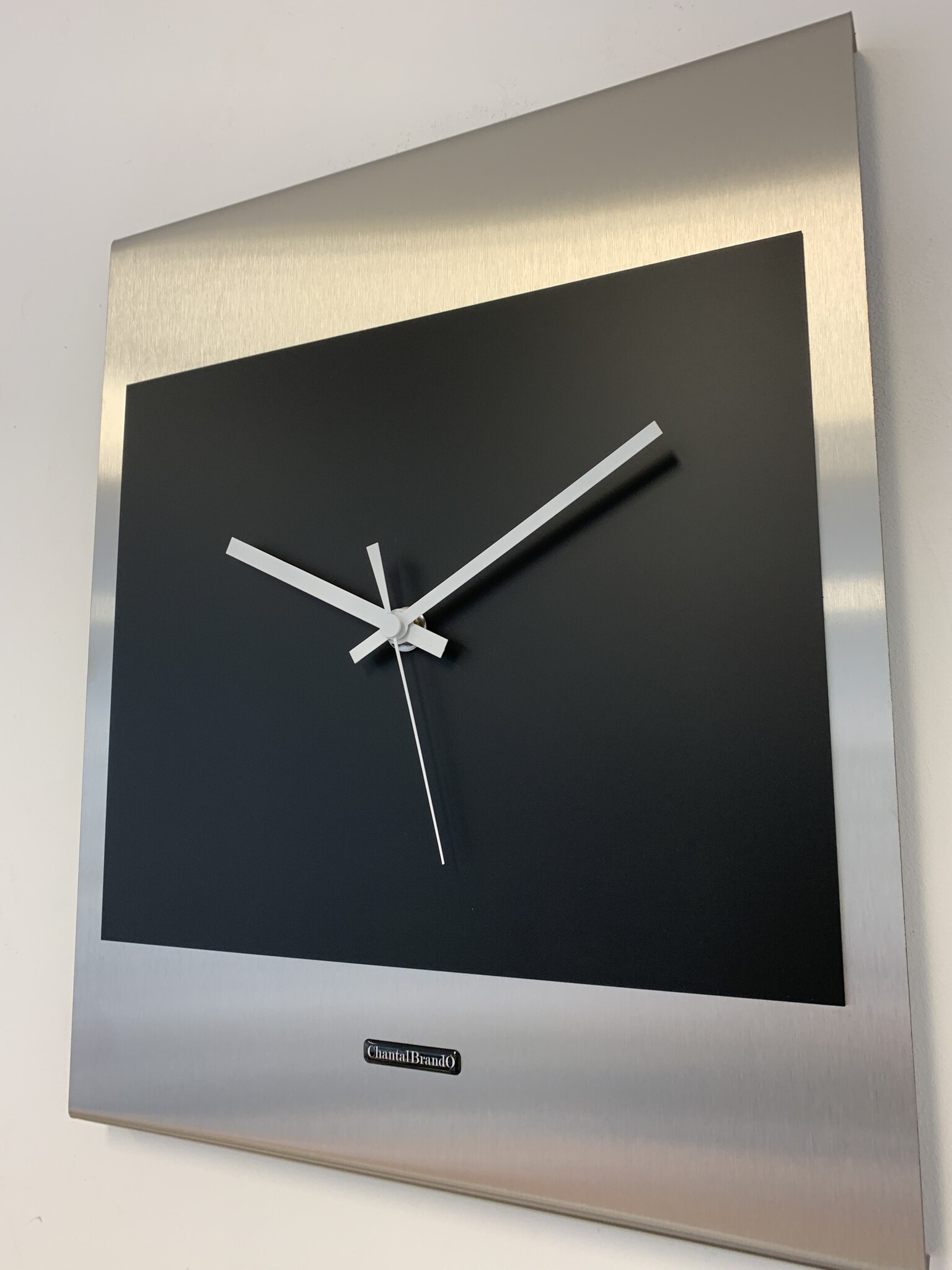 Op en top Nederlands Design. De wandklok is geheel van RVS geborsteld metaal vervaardigd en met een opgelegde zwarte metaal rechthoek