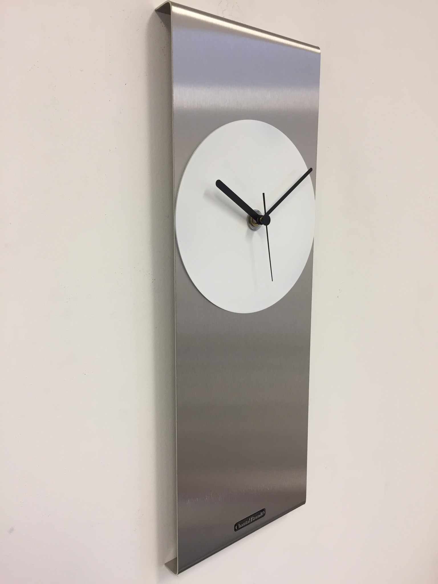 Moderne wandklok geheel van RVS metaal. De lengte is 50 cm x 18 cm breed. De boven en onderzijde zijn 90 graden gebogen. Een RVS witte cirkel siert dit uurwerk, uitgevoerd met zwarte afgeronde wijzers.