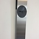 De opgelegde RVS cirkel is in een grijze lak gespoten, met zwarte wijzers.